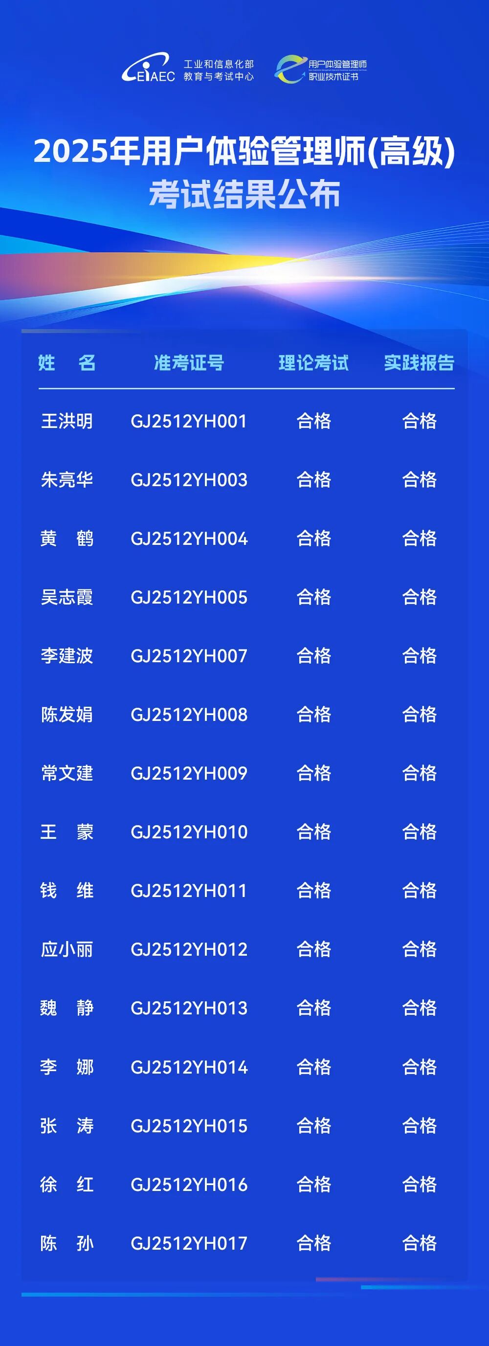 用户体验管理师(高级)培训于2025年10月27-30日在线上进行。内容涉及体验战略、风险管控、体验创新、体验管理、体验旅程、设计优化、质量管理和实践案例八个版块。本项目依托工信部教育与考试中心权威认证体系,通过“理论+实战+考试+取证”模式,填补客户服务领域体验管理专业化人才培养空白。学员们在全部培训课程结束后完成了考试,现将考试结果公布如下,并对顺利通过考试的学员表示祝贺!
