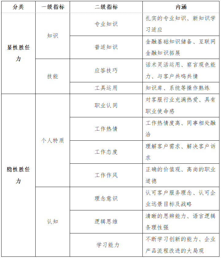 显性胜任力主要包括知识和技能,具体到客服岗位的知识与技能至少包括以下方面:专业知识、普适知识、应答技巧和工具运用。