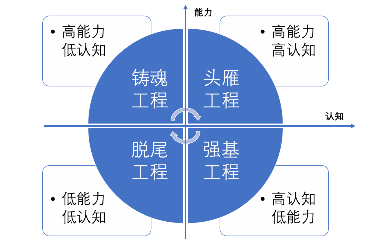 第二,通过“领雁工程”将“高能力-高认知”人员培育成典型与标杆,加大该类人员的培养与肯定,使其获得更多培训和进修的机会,通过经验分享、专项成果等项目,提升“高能力-高认知”人员的能力,实现优质成果输出。