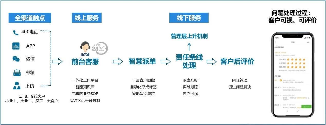 碧桂园服务客户交互中心从客户视觉出发,借助数字化平台实现客诉反馈渠道多样化,通过“线上+线下”综合一体化的体验模式,将客户诉求拆解到“事件管理”,追责到人、客户验收。