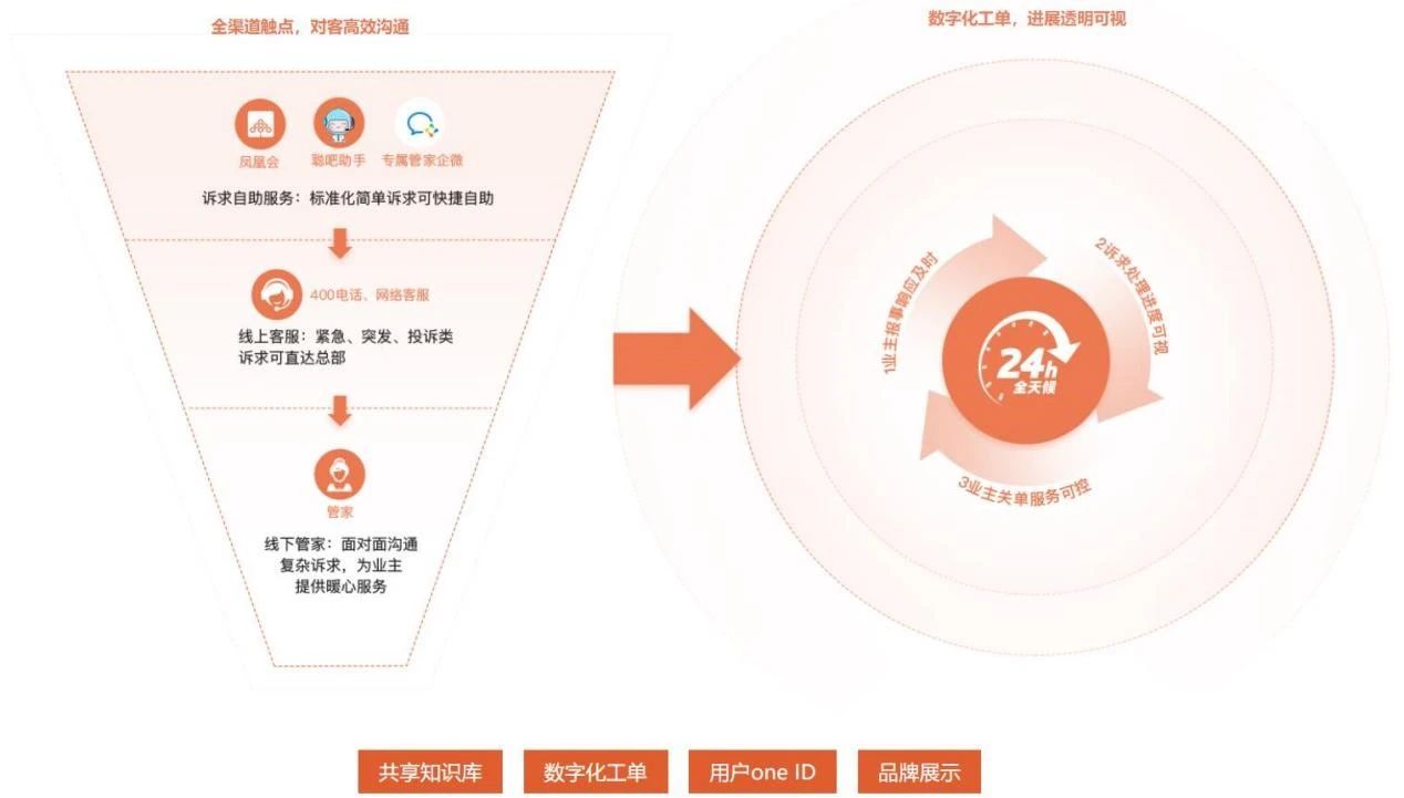碧桂园服务客户交互中心的服务范围较为广泛,不仅包括日常的服务需求,如报事、报修、放行、咨询、投诉,还包括紧急情况下的问题处理,如火灾、水管破裂、困电梯等,需协调属地项目管家、安保、工程、保洁、房产等多个服务团队线上与线下共同处理。数字化工单系统发挥其重要作用,实现对客户诉求接收、跟进、完结的全流程高效流转,以及实现流程可视化,打破诉求仅停留于“道听途说”的固有格局。