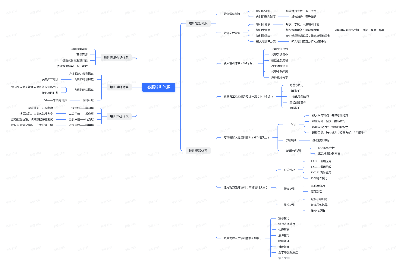 培训体系建设在客服体系中是必不可少的一部分,包括课程体系、内训师体系、培训制度体系、培训效果评估等。课程体系又可进一步按岗位、在职时间、产品、内容划分,例如电话客服培训、在线客服培训、质检培训、TTT培训、管理认知培训;新人业务培训、在职员工服务技巧提升等,这里不做进一步展开讲解,详情参考下图: