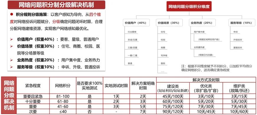 在网络线,客服部与云网中心共同制定了网络问题积分制分级解决机制,与交付中心协同推进了基于平台能力识别质差用户并派单解决机制。