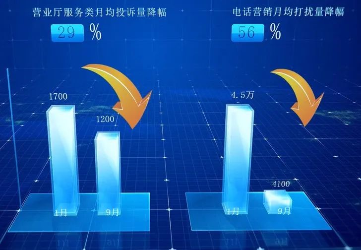 经过营销管理的数字化赋能,营业厅服务类月均投诉量从1700余件下降至1200余件,降幅29%;电话营销月均打扰量从4.5万件下降到9月4100件,降幅91%,真正实现各触点服务责任压实。