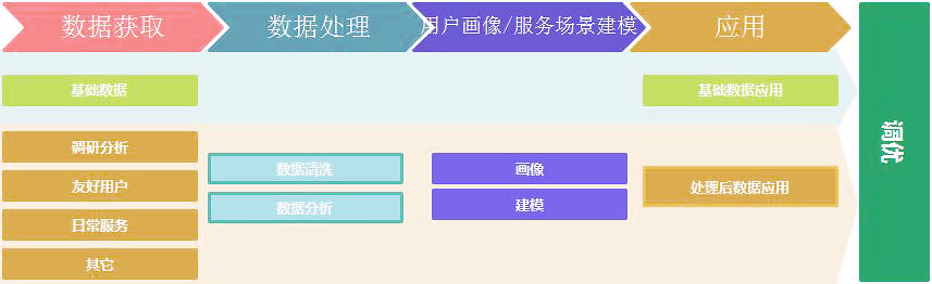 数据获取(直接应用标签/处理后应用标签)→数据处理(数据清洗/数据分析)→用户画像/某类用户建模→应用→数据更新(用户画像/某类用户建模)调优。