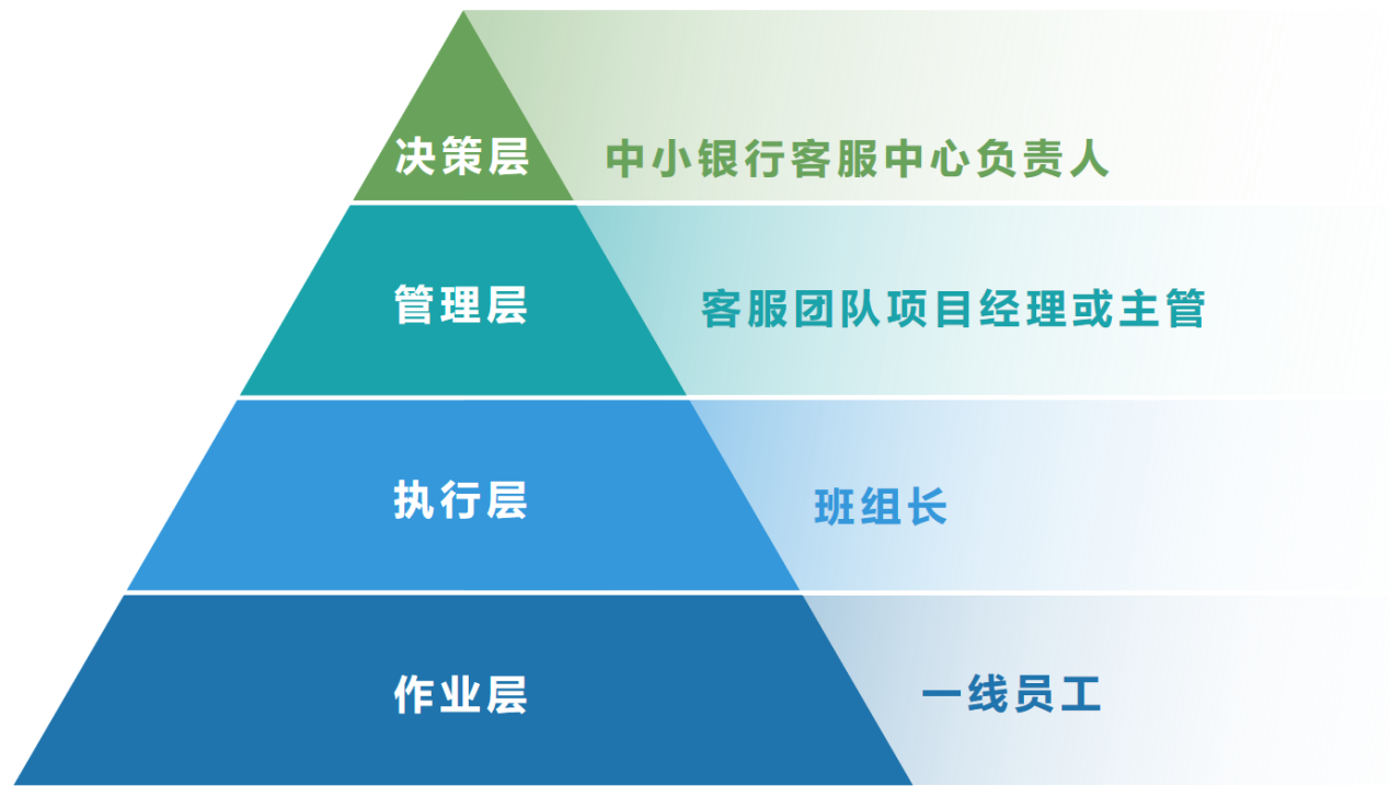 客户联络中心行业从纵向管理结构上一般划分为四个层次:决策层、管理层、执行层、作业层。
