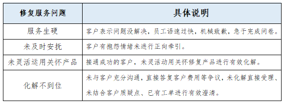 保障修复质量,持续强化集中修复员工服务能力,提升员工主动服务意识、要求接触成功未提单客户修复产品100%运用,修复人员服务准确率、修复工单处理准确率不低于95%。过程中对修复录音专项质检监测,发现修复服务情况和工单未解决问题(如表1、表2),实时强化、及时纠偏。