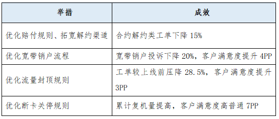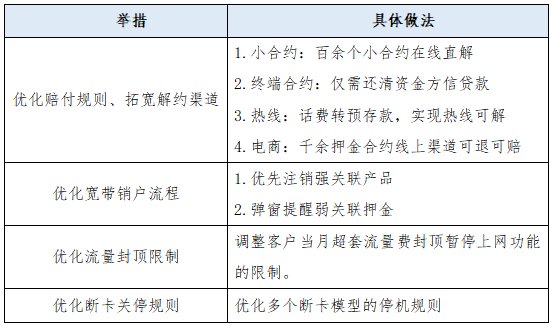对于重点问题,予以整改调优:优化赔付规则、拓宽解约渠道,优化宽带销户流程,优化流量封顶限制,优化断卡关停规则、拓宽认证复机方式。