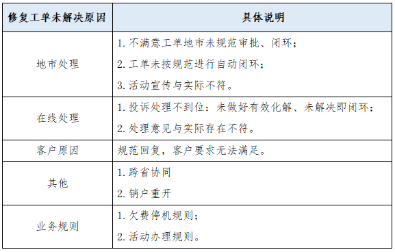 对修复结果为不满意的问卷进行重点关注,围绕不满问题原因进行梳理,聚焦“提前解约、宽带注销、流量争议、断卡复机”四个方面问题,进一步原因分析。