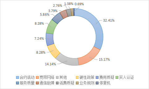 对问卷进一步聚类分析,输出关怀修复结果,引起潜在不满客户不满的主要问题类型有:合约活动、宽带网络、硬性政策、费用质疑、实人认证、服务质量、通信故障、话费质疑、业务规则、停复机。