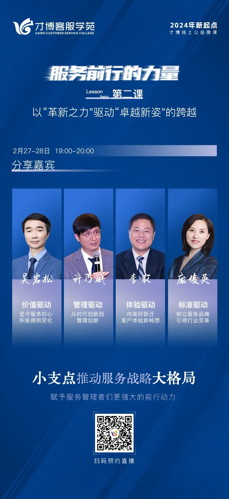 2月21-22日晚19:00-20:00,由才博客服学苑举办的开年第一课《服务前行的力量》线上公益微课圆满结束。此次线上公益课程旨在帮助客服人员快速调整状态,补充正能量,有效应对节后综合征,以饱满的热情和积极的心态投入到每一天的工作中,为客户提供更加优质、专业的服务。