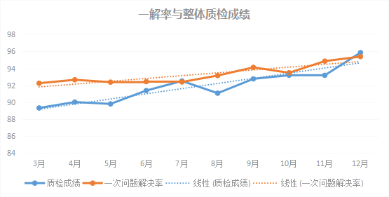 按质检成绩与一解率关联来看,月度质检成绩与月度一次问题解决率基本呈现正相关关系。