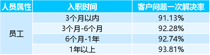 通过员工样本分析,入职3个月以内的新员工客户问题一次解决率较低,入职3个月至1年的较成熟员工客户问题一次解决率有所提升,入职1年以上的成熟员工客户问题一次解决率可达较高水平。故客户问题一次解决率与员工入职时间呈现正相关关系。入职3个月以内的新员工需要重点关注。