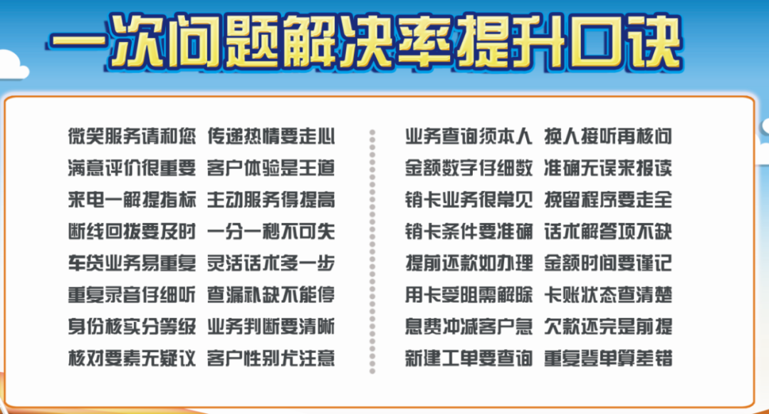 梳理易引发重复致电的业务类型,确定相关场景及对应话术,同时根据员工高频易错业务,编制提升口诀。