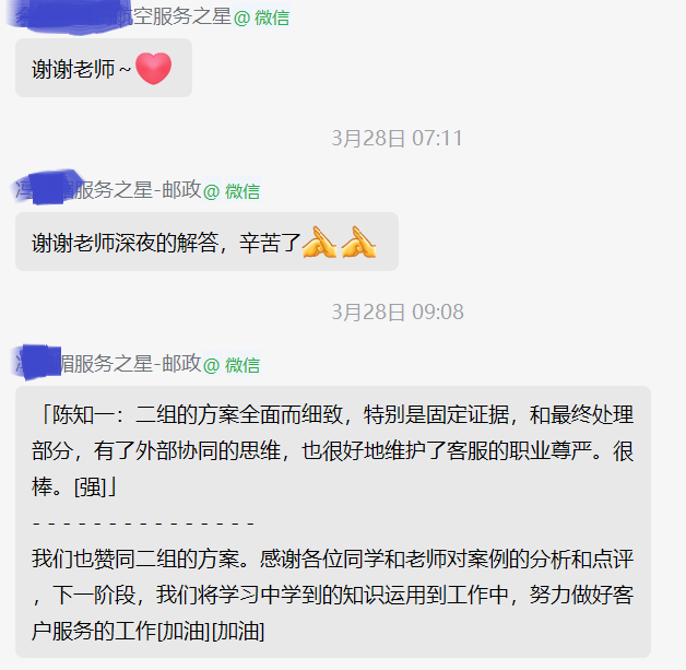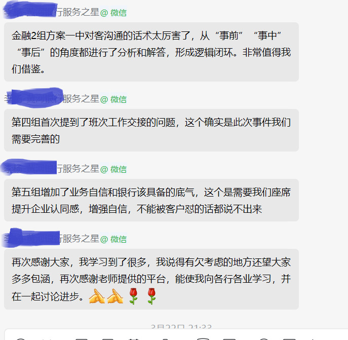 第二阶段线上社群辅导,于3月22-27日进行。2天的理论课程告一段落后,训练营进入5天的社群互动辅导环节。全员分为5个小组,由前期收集和提交的案例作为社群辅导的基础,在每天的社群案例拆解环节中,大家积极深入探讨不同行业、不同场景的疑难案例。社群互动中,大家分享专业知识、共情服务难点、化解服务痛点,开阔服务眼界,拓展行业视野。尽管来自不同行业,但大家踊跃的互相支招、讨论,真正实现了学习和实践相结合。这种跨行业的交流互动不仅激发了创新思维,也使得理论知识与实际操作得以紧密结合。社群成员们互相支持、出谋划策,形成了一种深度参与、互惠共享的学习模式,每次的交流讨论都让大家收获满满,即使活动结束,大家仍觉意犹未尽,期待下一次的思想碰撞与智慧交融。