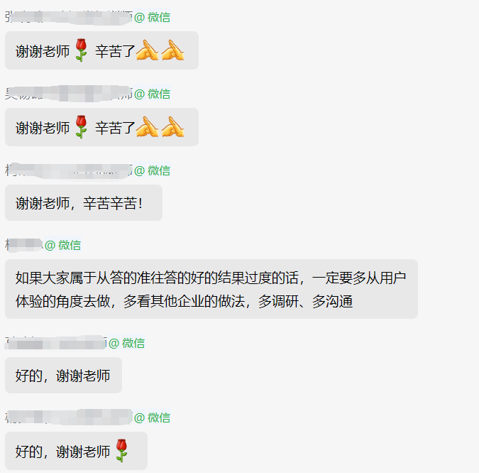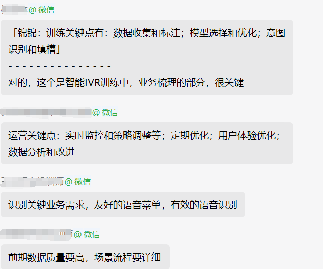 第二阶段线上社群辅导,于3月25-29日进行。社群辅导打破了传统培训模式的时空限制,让学员们能够随时随地与老师和同学进行互动交流。社群每日着重围绕一个核心问题进行深度辅导和答疑解惑。通过这种方式,学员能够积极参与问题剖析,深入理解相关知识点,并将其灵活运用于实际工作场景,显著提升理解和应用能力。学员们提出在训练或实际工作中遭遇的挑战和疑问,在社群内获取杨老师的专业指导及多元见解,形成互助共享的学习氛围。通过专题讨论、经验交流、案例研讨等,帮助学员拓展行业视野,积累实战经验,进一步提升在智能客服领域的专业素养与实践操作水平,切实提高自身业务能力与解决问题的能力。