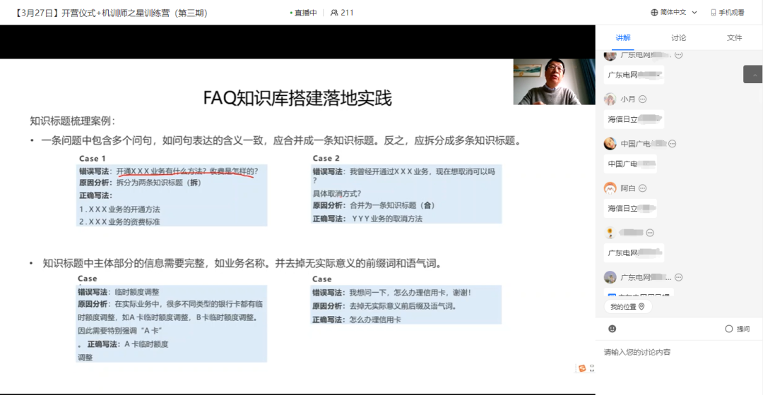 第一阶段线上直播培训,于3月19-20日进行,杨茂林老师以其丰富的实践经验和深厚的专业知识,为学员们带来了关于机训师工作的深刻解读,展现出了该行业的发展趋势和潜在机遇。在训练要求方面,老师强调了理论与实践相结合的重要性,通过诸多实际案例,帮助学员们更好地理解和掌握机训师所需的专业技能。课程内容深度涵盖了知识采编策略,如何进行跨渠道的有效协同,入口与交互页面的设计优化,以及拉新推广方法。此外,还深入探讨如何通过持续优化智能客服功能,进一步提升客户体验,从而达到最大化客户满意度的目标。