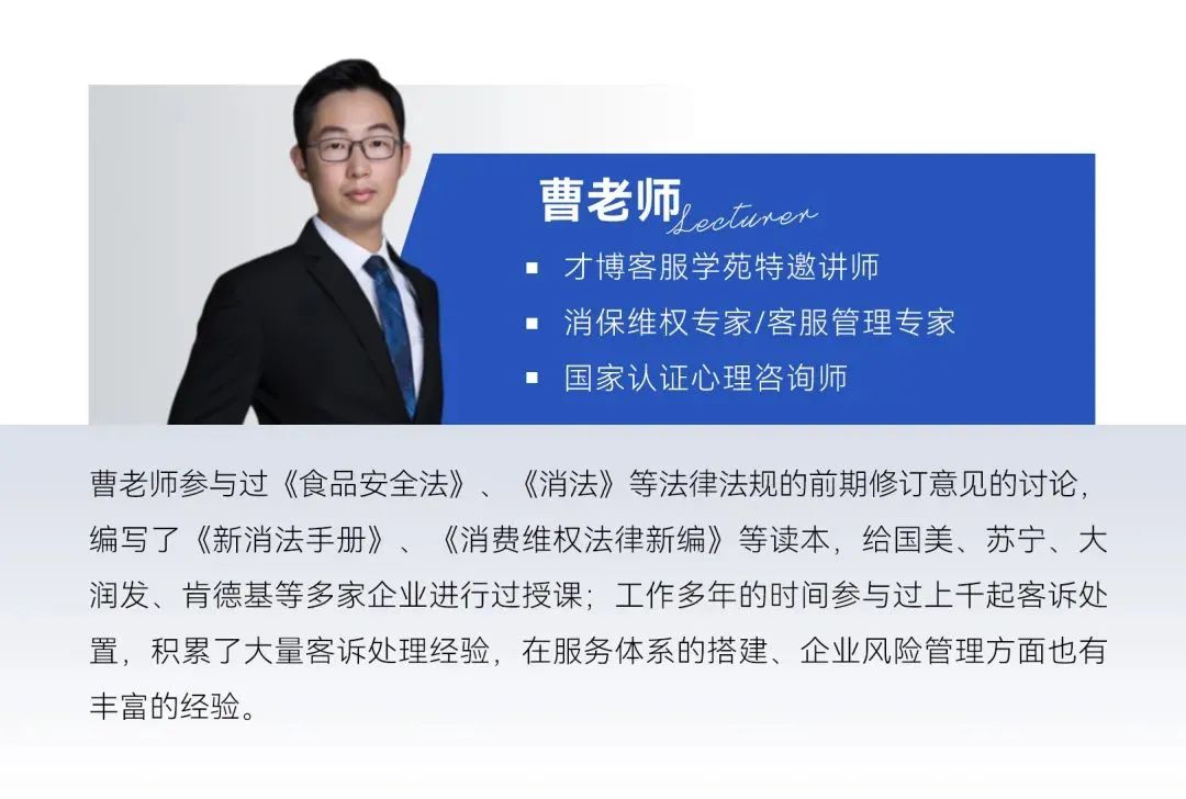 老师曾在消保委体系负责投诉咨询工作,多年深耕于消费者权益保护法领域,本次课程,凭借丰富的实战经验和深厚的专业底蕴,内容紧扣实际场景,力求呈现给行业最前沿的法律法律政策解决及突破投诉困境的应对策略。