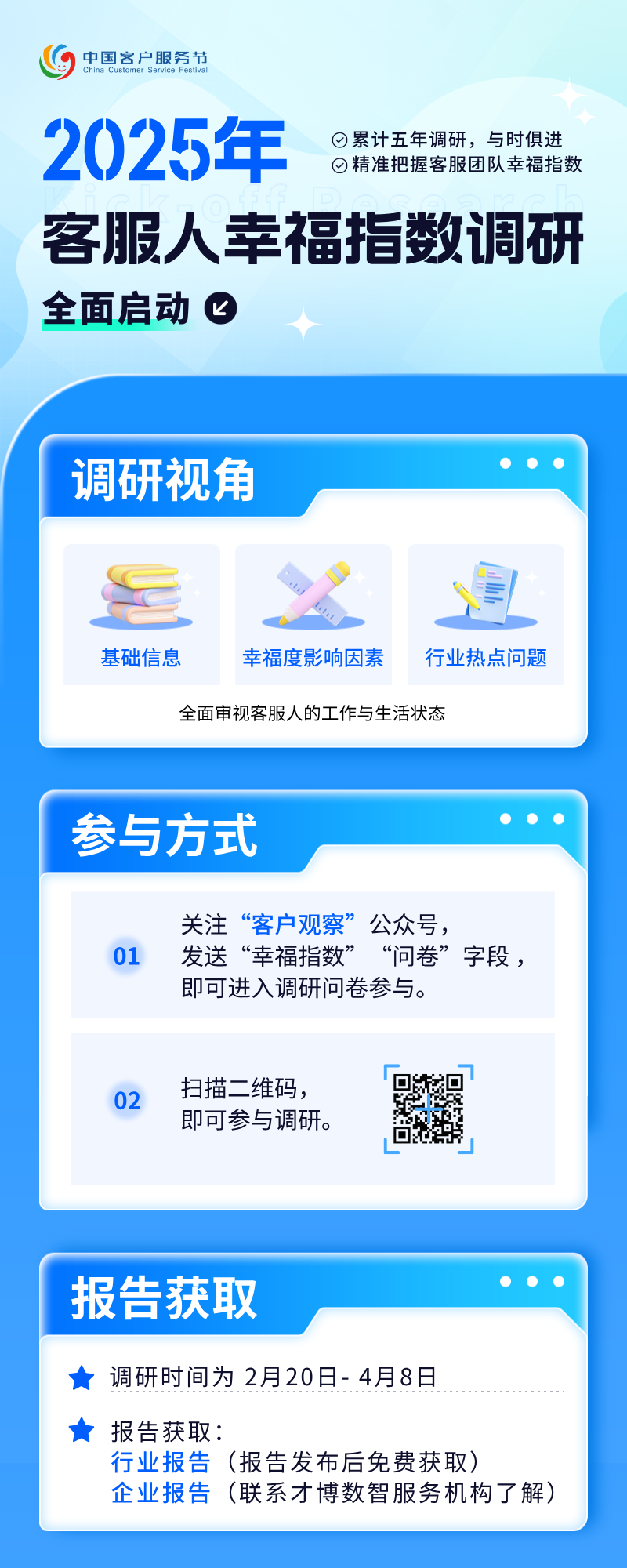 《2025年客服人幸福指数调研报告》已全面启动调研数据采集,为保证顺利编撰、发布 ,现邀请全国各地方、各行业客服人、协会,各有关单位以及企业给予支持和配合,共同做好2025年报告的编撰、发布的相关工作,为客服行业贡献自己的一份力量!