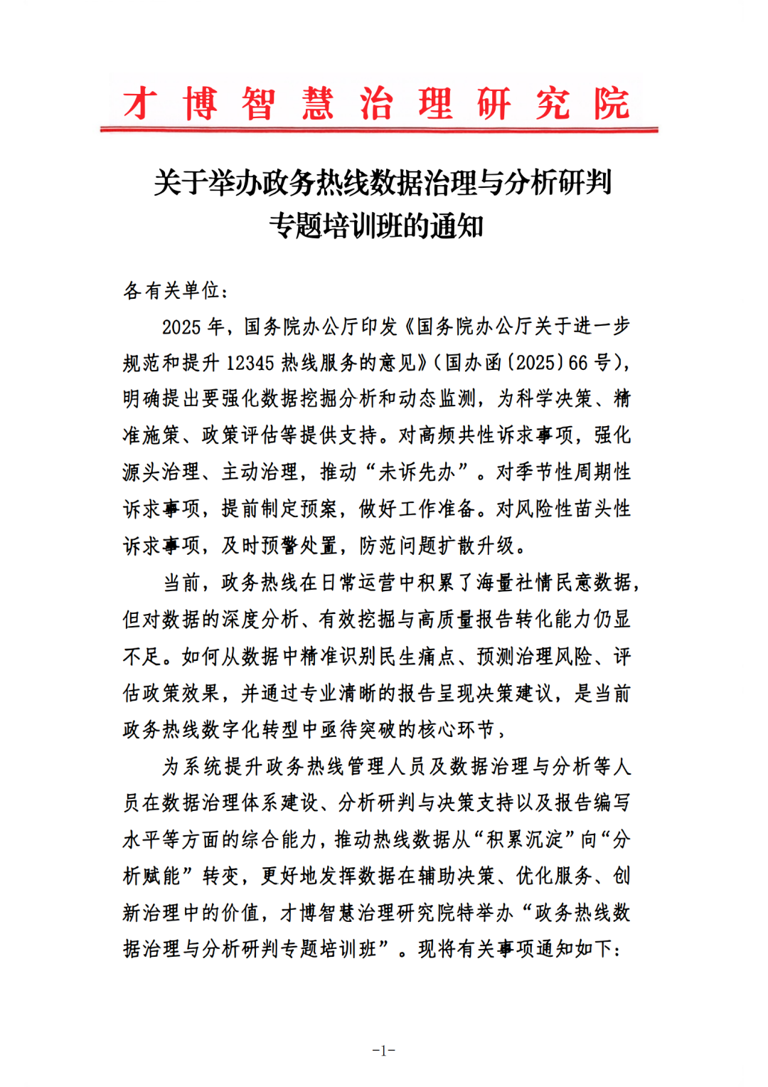 为深入贯彻落实国办66号文件精神和国家对政务热线的决策部署,构建政务热线管理干部以及相关人员与数字化转型相匹配的能力体系,更好发挥数据在辅助决策、优化服务、创新治理中的价值,政务热线数据治理与分析研判专题培训班(下称“培训班”)将于3月26日—28日在广东广州市开班。本期培训班由才博智慧治理研究院主办,中国城市报数智服务与治理专委会协办,清华大学数字政府与治理研究院提供学术支持。
